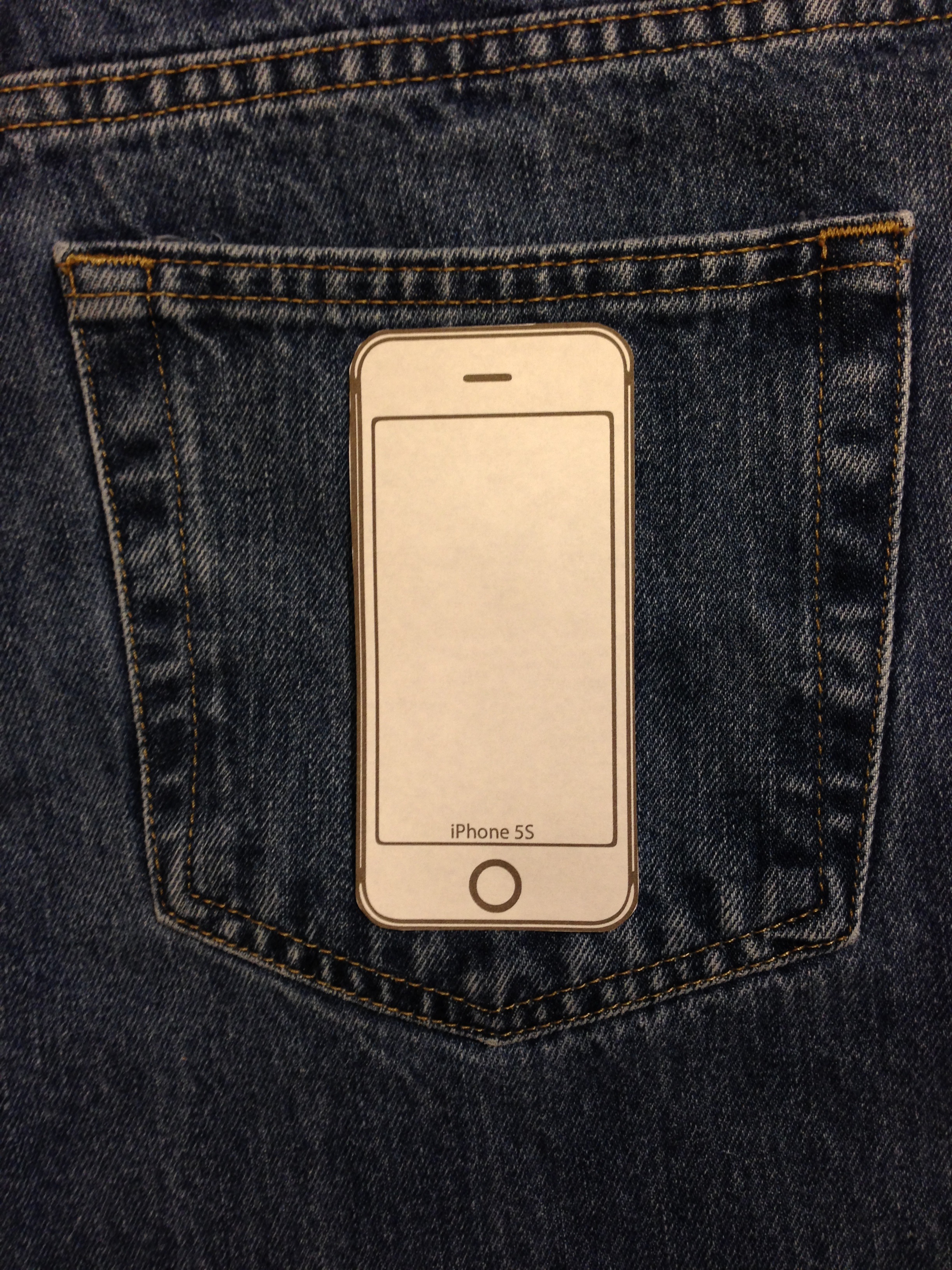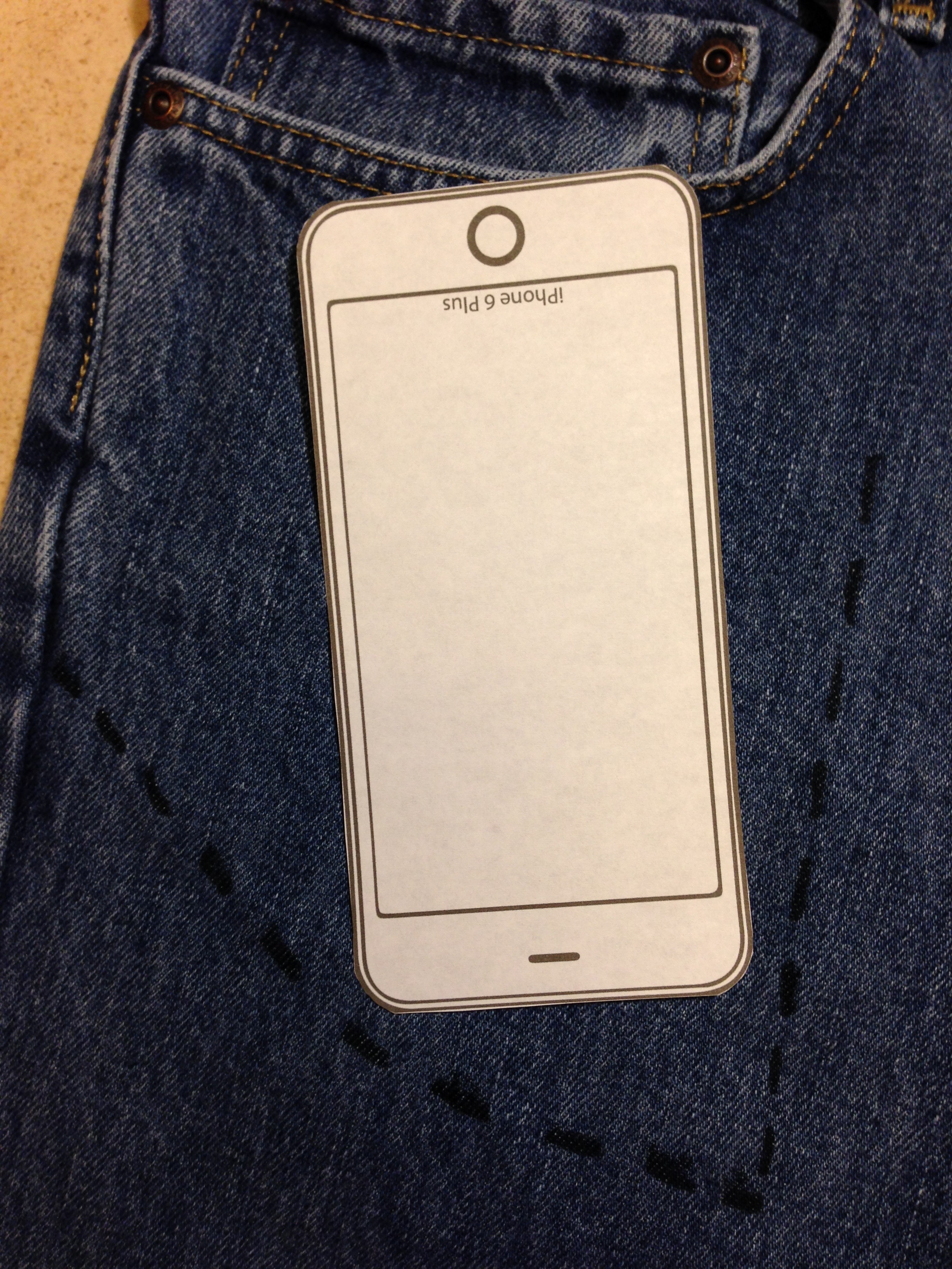 First, to be as nearly scientific as possible, I went around the house measuring jeans pockets (I pretty much only wear jeans, so I wasn’t so much interested in going down the pants-other-than-jeans rabbit hole). The standard pair of brand name jeans has a pocket that measures 5″ wide by 6″ deep. My iPhone 5S fits in there with a cover on it, no problem. (UPDATE: I’ve added front pocket images; scroll down to see them.)